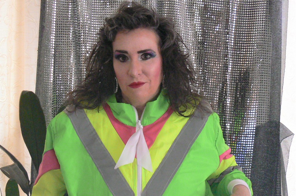 Image description: A photo of Megan from about chest up. They have long dark hair, and dark eyes. They have heavy stage makeup. They are wearing a fluorescent top that has geometric patterns or lines. It is green, yellow, pink and silver. Behind them is a silver sequinned curtain and a plant.