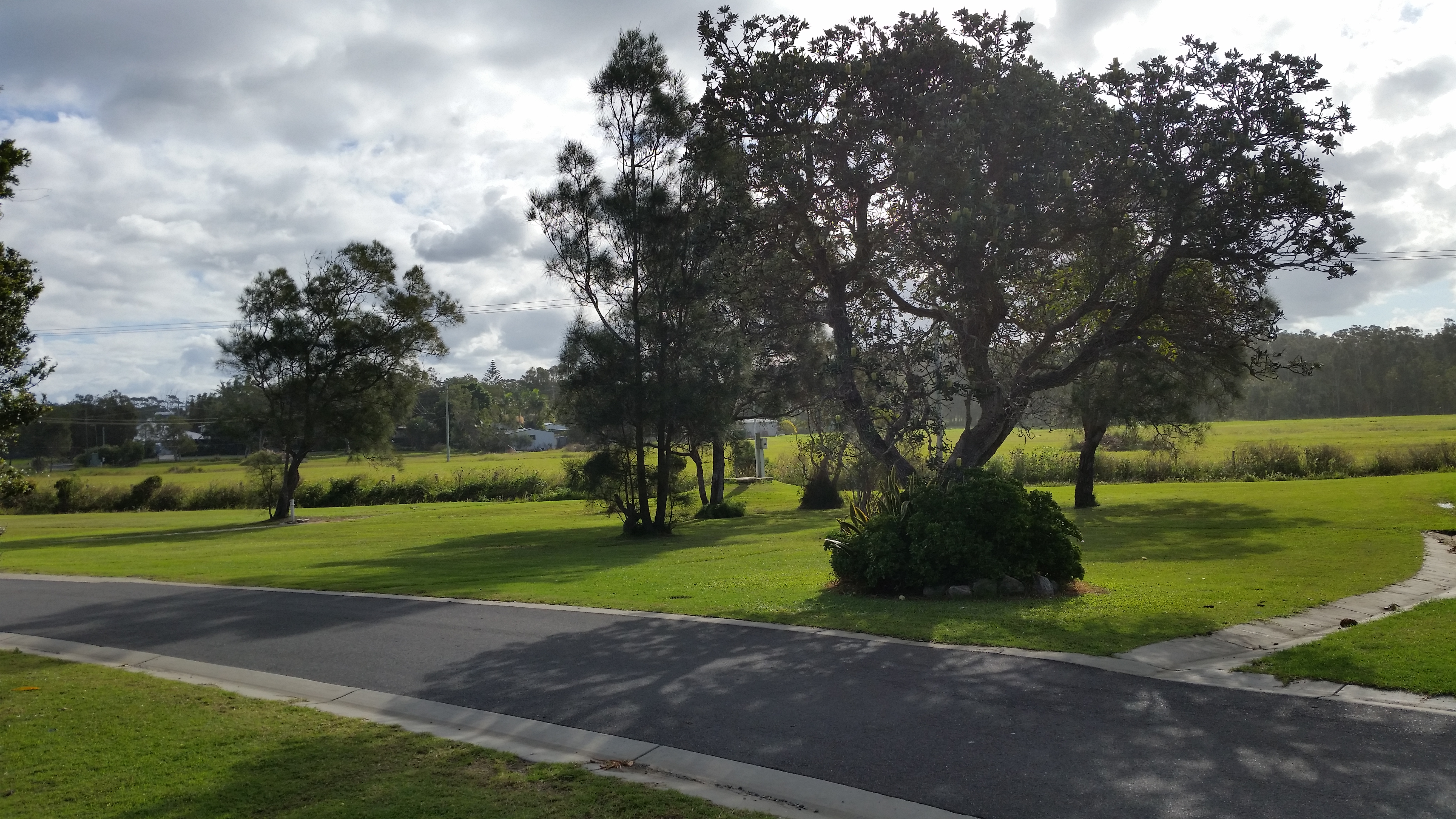 Image description: It is a photo at the front we see a road and then lots of very green grass with a big tree in the middle and a few smaller trees towards the front. Off in the distance we see more grass and a line of trees. The sky is filled with fluffy grey clouds.